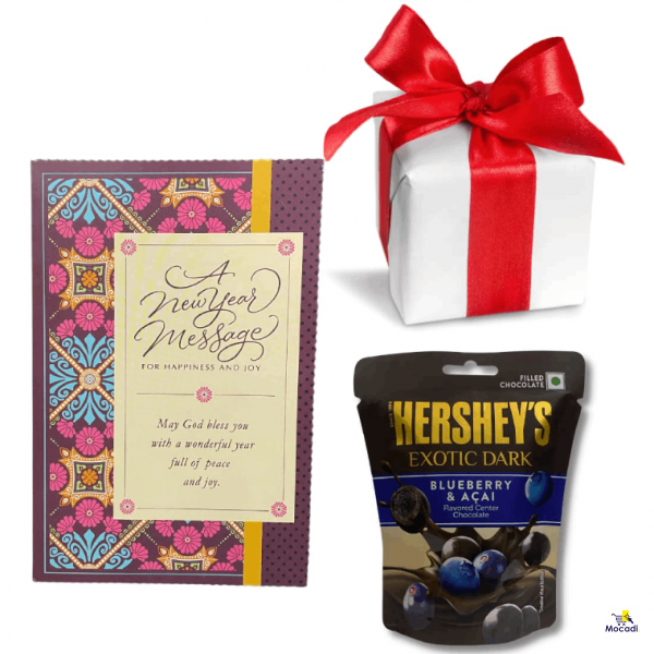 • This Combo Includes: Premium New Year Greeting Card, Hershey's Kisses Blueberry Chocolate Box with Gift Wrap and Customize Message Option