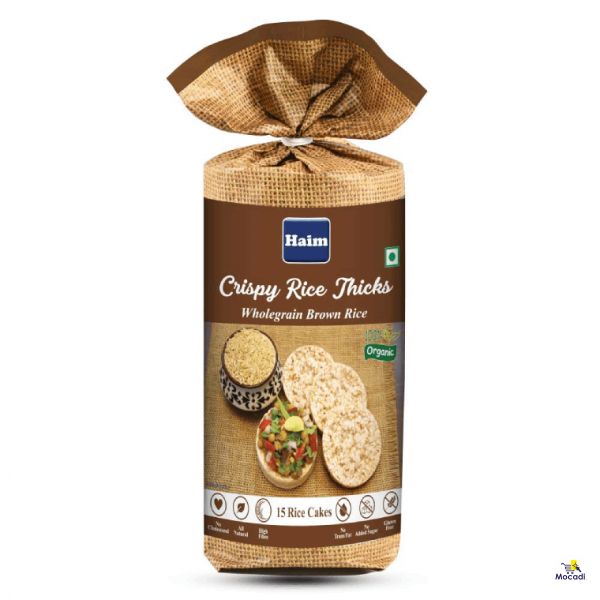 • All Natural Haim Crispy Rice Thicks Wholegrain Brown Rice Cakes are 100% Organic, High Fibre, ultra low fat, and Gluten Free. They have No Cholesterol, No Preservatives, No Hydrogenated Oils ( No Trans Fat ), and No Sugar. Perfect for Guilt Free and diet-friendly Snacks for all ages.