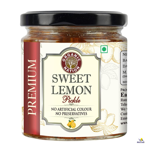100% Home Made Oil-free Pickle. Organic Nation Sweet Lemon Pickle is made with an original traditional recipe that gives you the essence of mother's and grandmother's love.
