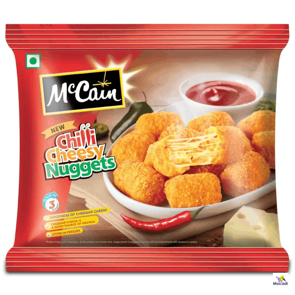• McCain Chilli Cheesy Nuggets are delicious snacks that are hot and crisp on the outside yet have a soft, melting cheese filling with a flavourful hit of red chilli flakes. Chilli Cheesy Nuggets is the only product that contains Natural Cheddar Cheese which is a good source of protein & that too 28% of it.