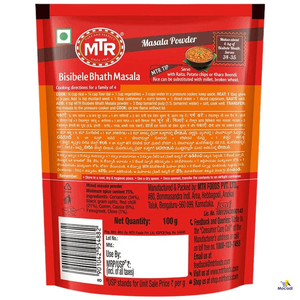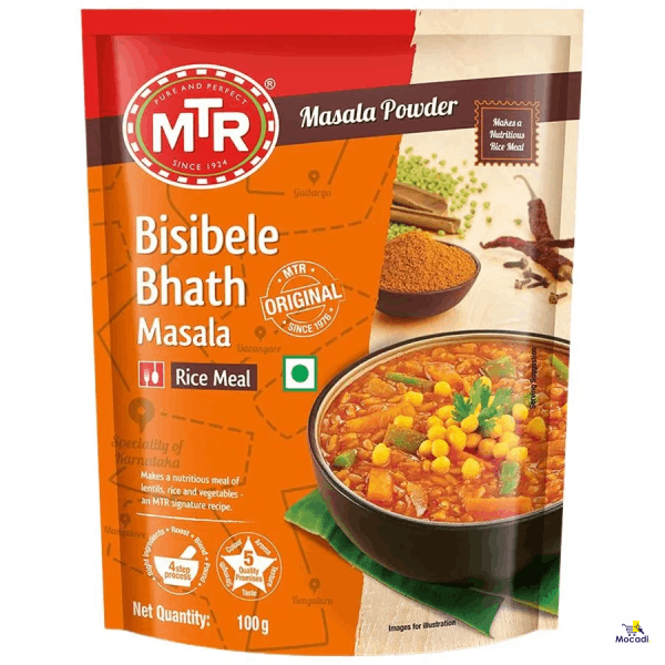 • MTR Bisibele Bath Masala contains the right proportions of several spices and vegetables that go into making the traditional bisibele bath delicacy. It contains no preservatives and comprises of 100% natural ingredients.