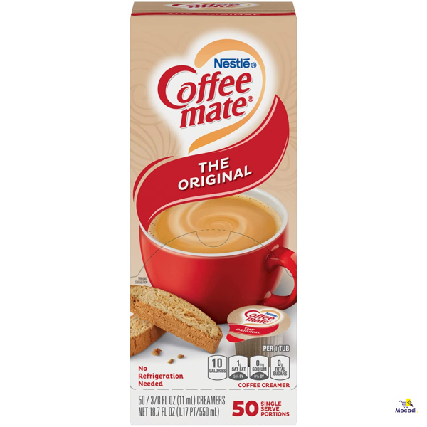 Coffee-mate Original liquid creamer is a rich and delicious creamy nondairy creamer that delivers a consistently perfect cup. The single-serve cups in a convenient dispenser keep your counter clean and organized. With this popular creamer in the office, everyone can enjoy coffeehouse indulgence without ever leaving the building. No refrigeration is necessary. Creamer is Kosher Dairy, lactose-free and gluten-free. Original flavor. Lactose-free. Nutrition Facts. Contains 50 individual 0.38 oz. cups. Product is kosher. Gluten-free. Ingredients: water, coconut oil, sugar, sodium caseinate (a milk derivative), dipotassium phosphate, mono- and diglycerides, artificial flavor, beta-carotene color.